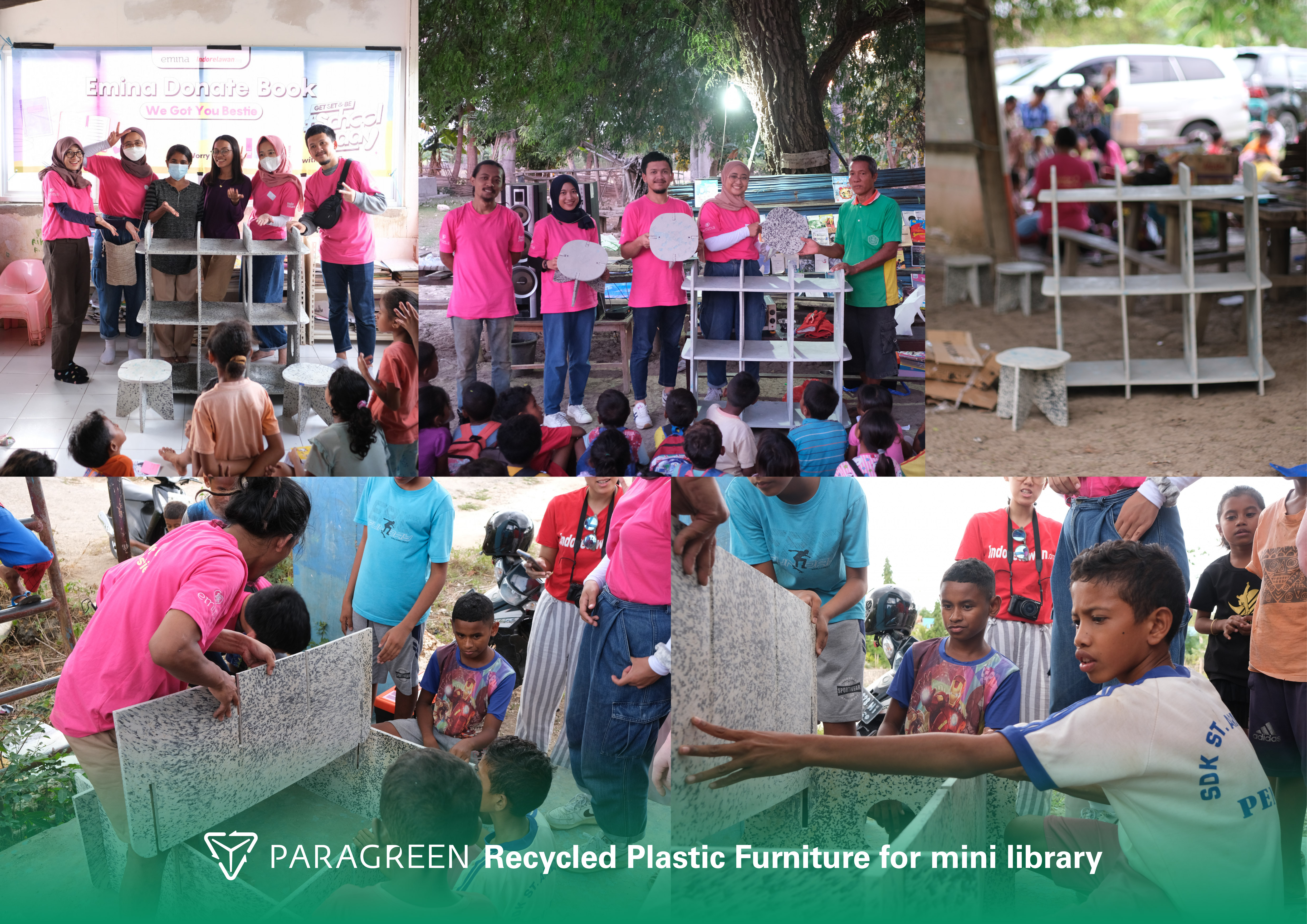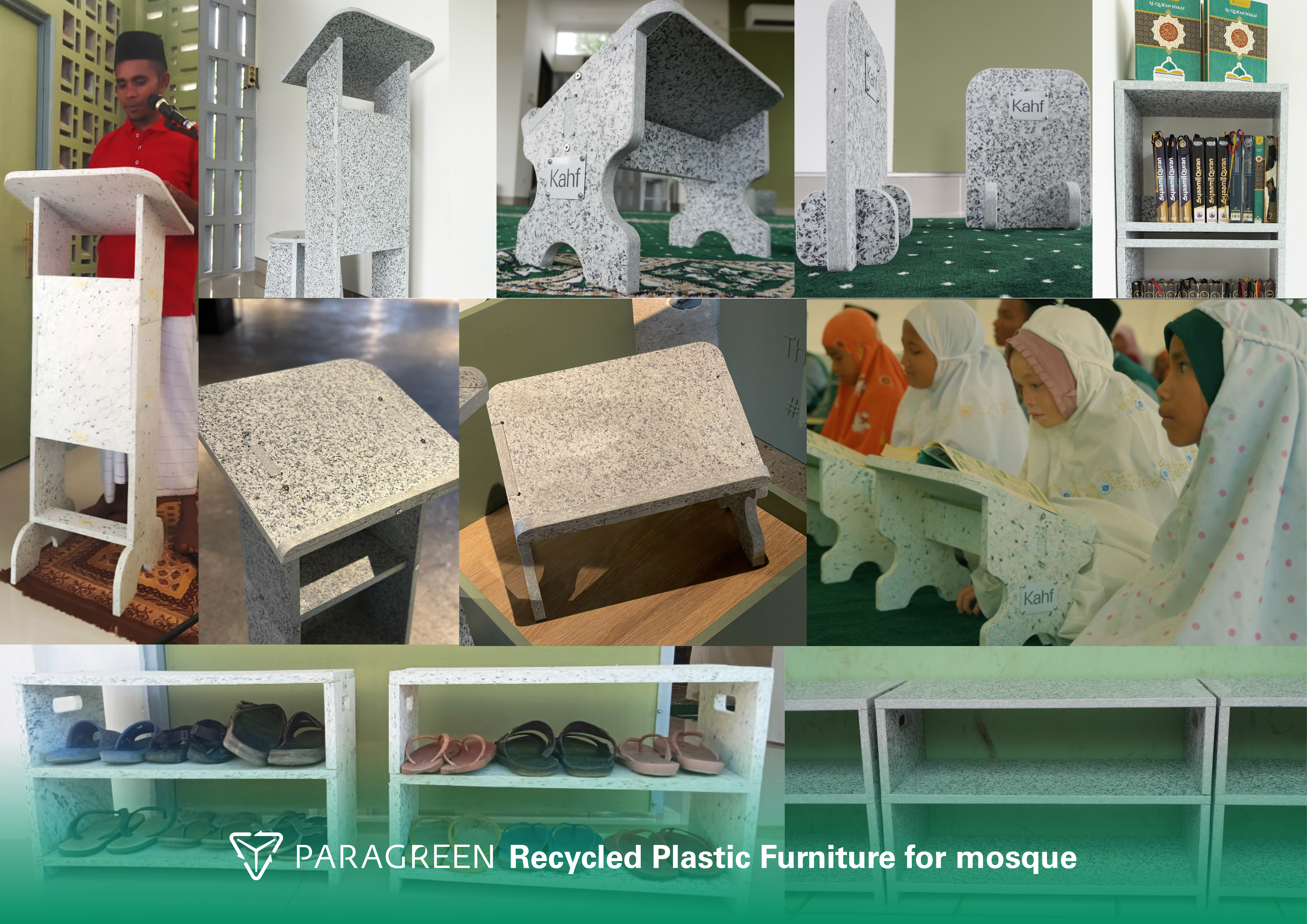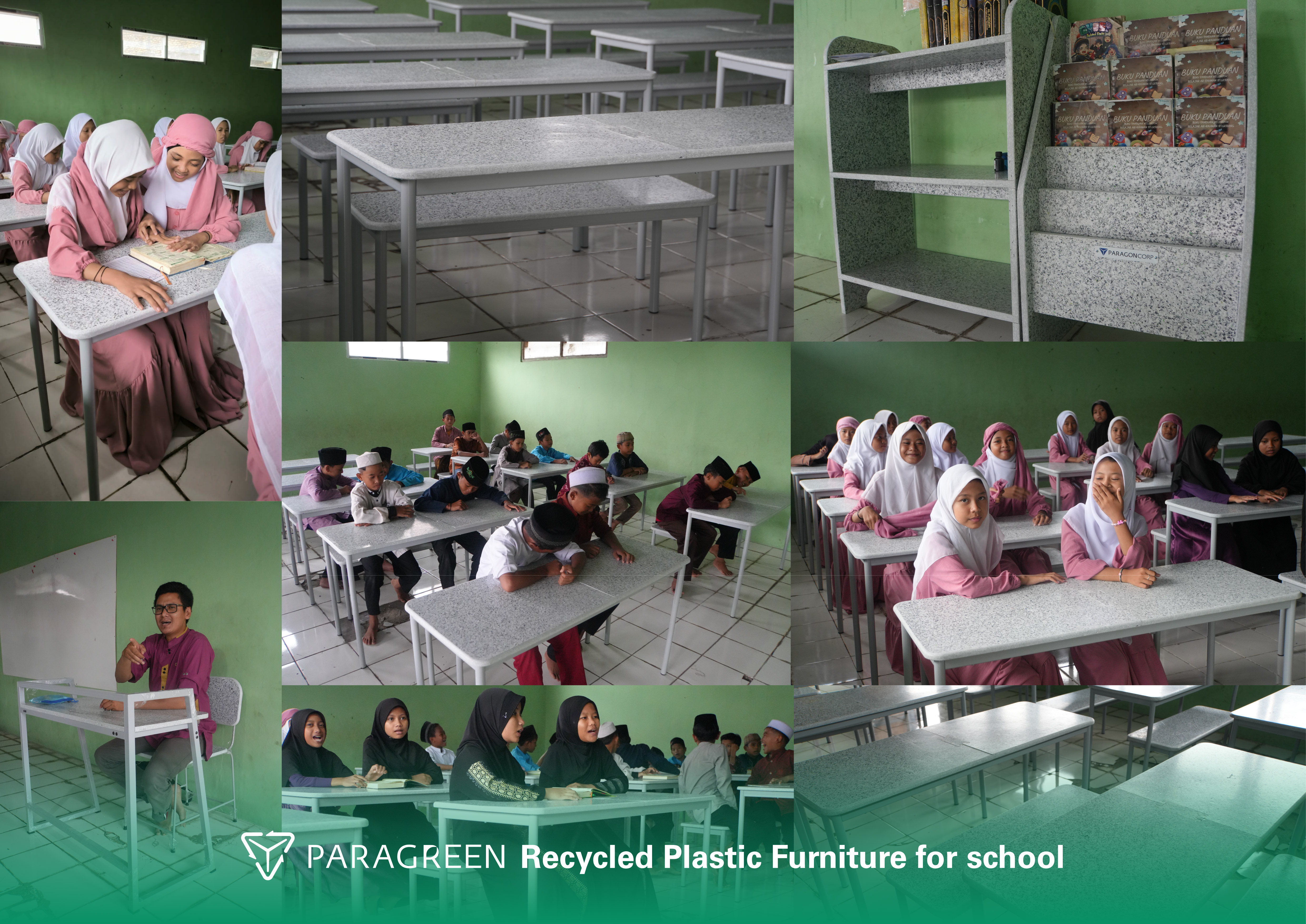 Paragreen Recycled Plastic Furniture adalah serangkaian desain furnitur dengan sistem knock down yang materialnya berbahan dasar plastik daur ulang dari limbah kemasan kami. Paragreen Recycled Plastic Furniture dapat digunakan di sekolah, sarana ibadah, maupun fasilitas sosial dan umum lainnya. Tinggal dipilih jenis produk yang sesuai dengan peruntukannya.